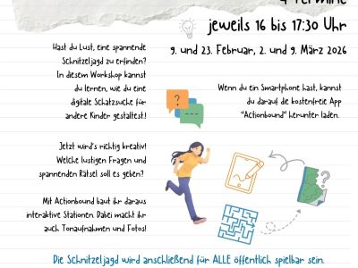 Hast du Lust, eine spannende Schnitzeljagd zu erfinden? Dann melde dich an für insgesamt 4 Termi...
