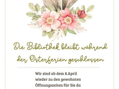 Die Kreisbibliothek bleibt in den Osterferien vom 20.3 bis 7.4 geschlossen. Wir sind ab dem 8.4.2...