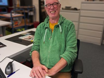 Dieser fröhliche Herr in Grün ist Detlef Puls-Will, der unser Team an der Ausleihtheke unterst...