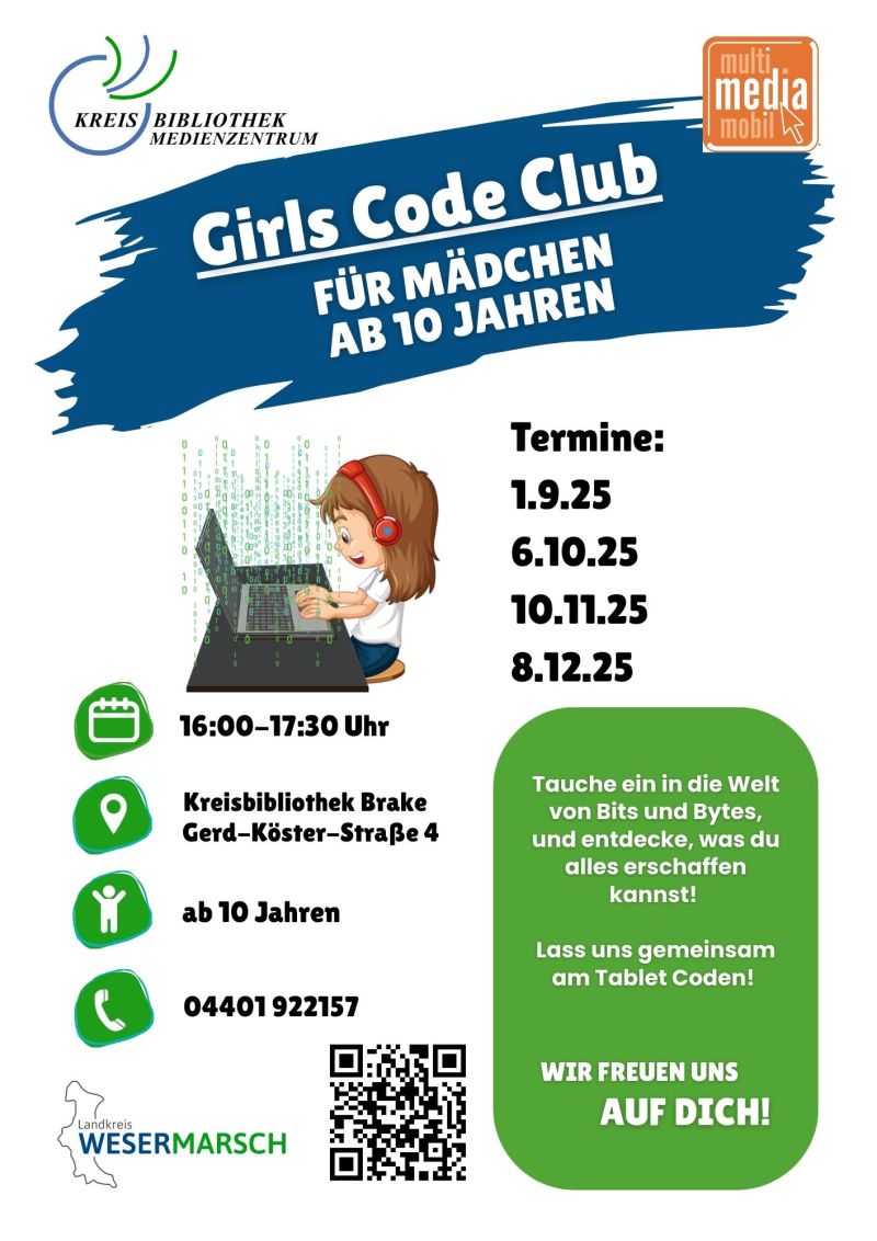 Alle Mädchen ab 10 Jahren können am 10.11.2025 um 16 Uhr vorbeikommen, um gemeinsam zu tüfteln und spielerisch die Grundlagen der Programmierung zu lernen.