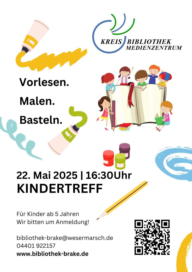 Es geht wieder los: Vorlesen,Malen, Basteln am 22.5.2025 um 16.30 Uhr- für alle Kinder ab 5 Jahren. Wir bitten um Anmeldung.