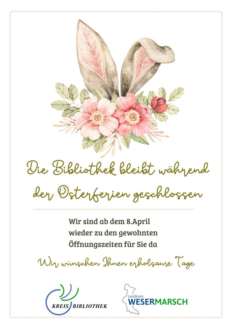 Die Kreisbibliothek bleibt in den Osterferien vom 20.3 bis 7.4 geschlossen. Wir sind ab dem 8.4.24 wieder zu den gewohnten Öffnungszeiten für Sie da.