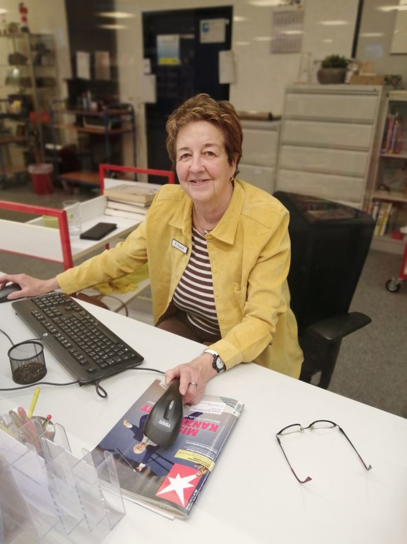 Hier sitzt unsere Birgitt an ihrem Lieblingsplatz in der Bücherei. Bei ihr werden Ausleihwünsche wahr. Schulferien mag sie nicht so gerne, da haben wir nämlich geschlossen. Das findet sie eher blöd. So ganz ohne uns. Außerdem sieht man sie eher selten alleine, besonders gerne arbeitet sie mit ihrer Kollegin Ariane zusammen. Aus gutem Grund! Die nette Ariane stellen wir Euch im nächsten Monat vor.