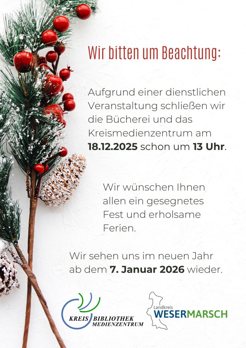Aufgrund einer dienstlichen Veranstaltung schließen wir am 18.12.2025 schon um 13 Uhr.
